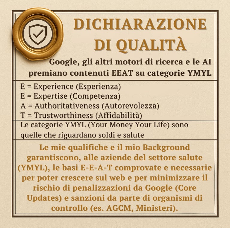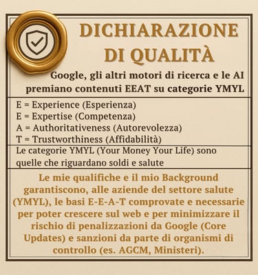 Sono qui per aiutare aziende, professionisti e team editoriali a comunicare in modo autorevole, sicuro e in linea con gli standard moderni di E‑E‑A‑T e YMYL.